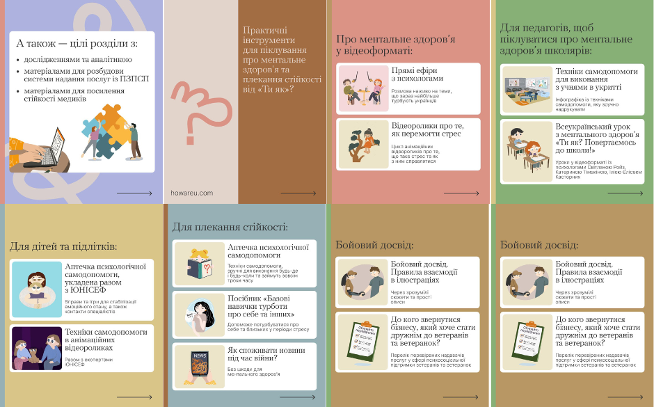 Ці ресурси допомагають знайти відповіді на важливі питання ментального здоров’я та підтримати себе та близьких у непростий час. Всі матеріали доступні за посиланням: howareu.com.