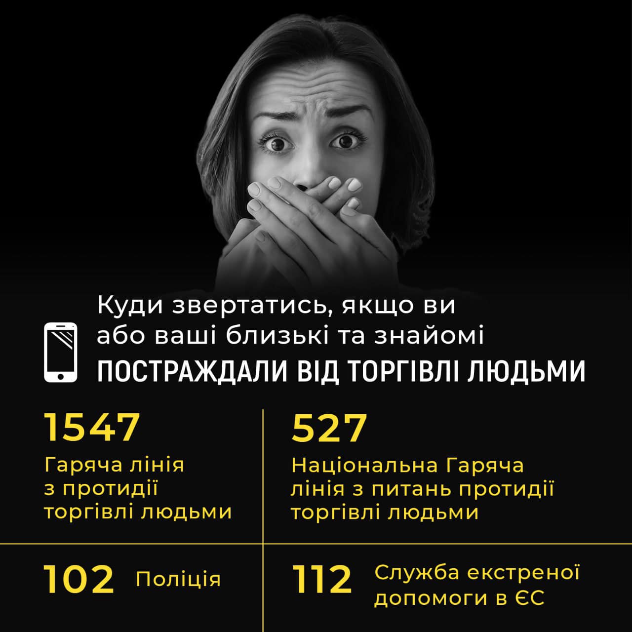 527 — Національна гаряча лінія з питань протидії торгівлі людьми. Цілодобово та безкоштовно.