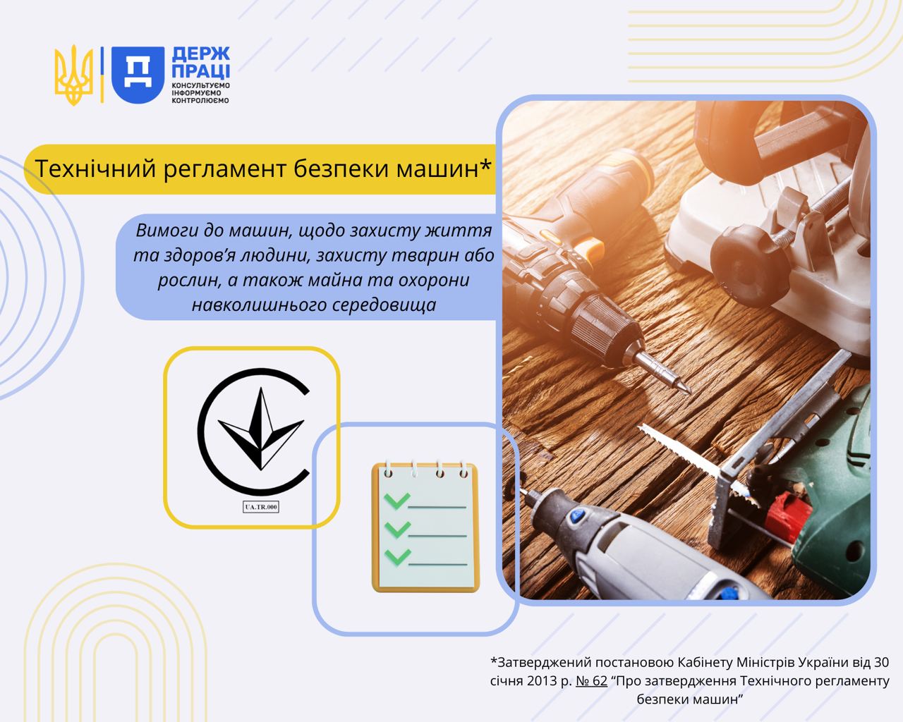 Під час заходу було роз’яснено, що цей Технічний регламент встановлює вимоги до машин щодо захисту життя або здоров’я людини, захисту тварин або рослин, а також майна та охорони навколишнього природного середовища, процедуру оцінки відповідності машин та вимоги до їх обігу на ринку України та/або введення в експлуатацію.